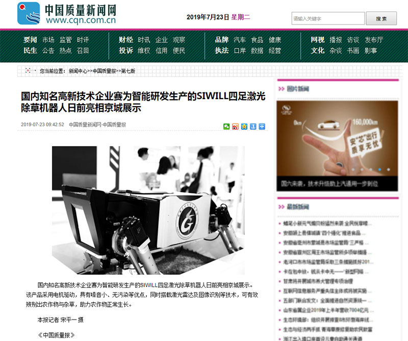 国内知名高新技术企业时搏官方注册智能研发生产的SIWILL四足激光除草机器人日前亮相京城展示。该产品采用电机驱动,具有噪音小、无污染等优点,同时搭载激光雷达及图像识别等技术,可有效辨别出农作物与杂草,助力农作物正常生长。本报记者 宋平一 摄 《中国质量报》